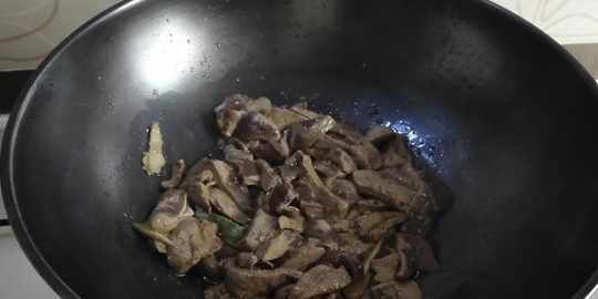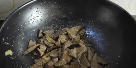 4.醃漬猪肝中的葱薑去掉,猪肝片放入油鍋中快速翻炒,電磁爐功率調至1400瓦