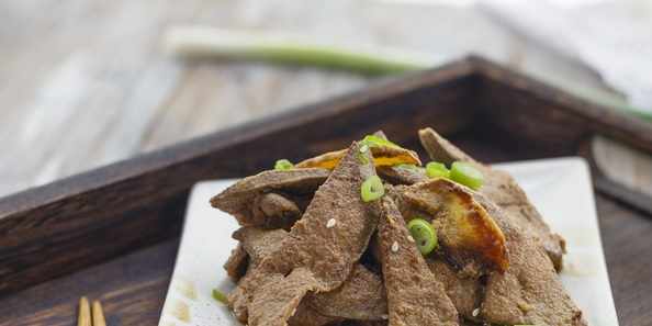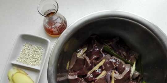 猪肝500克、麻油30毫升、薑4片、料酒一小勺、白芝麻少許、精鹽少許、幹澱粉少許