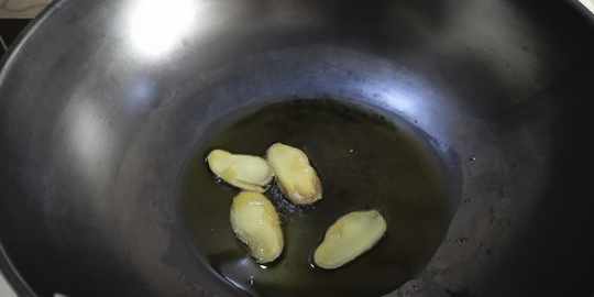 3.炒鍋放黑芝麻油燒熱,電磁爐用炒菜功能,功率800瓦,將薑片煎至黃