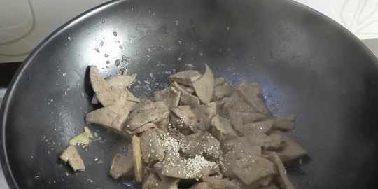 5.猪肝變色收縮時,放入料酒、白芝麻,炒勻