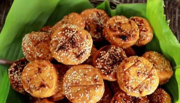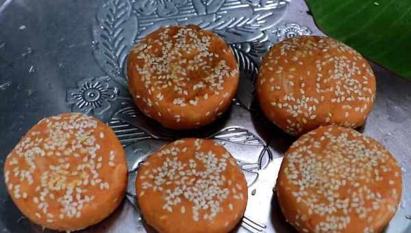將紅薯泥攪拌均勻後,將紅薯泥一個一個揉搓,將紅薯泥裹上芝麻,裝盤待用。包芝麻的目的是為瞭使食物口感好、香。女人把所有的東西都揉進蛋糕裡,做成面糊,然後抹上一點油。