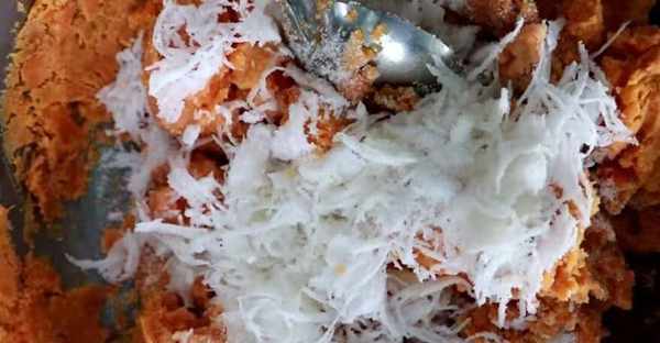 清洗幹凈後,將土豆切成小塊,放入蒸鍋中。一定要把它們蒸好。瀝幹水分後,把土豆從鍋裡拿出來放在一個大碗裡,用勺子把土豆搗碎。甜水果,然後根據需要加入糖、小麥粉和切碎的椰子,攪拌均勻。不喜歡甜的可以不用加糖,因為土豆是甜的。