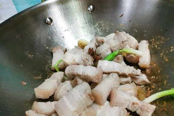 4.空鍋放入入五花肉煸炒出油,五花肉炒出油之後放入配料繼續翻炒,把香料炒出香味,然後放入冰糖炒至糖色,這一步還是很重要的,這一步决定這道菜吃的時候是否油膩。