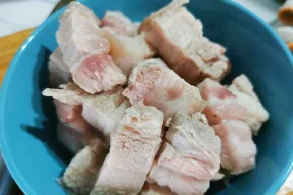 1.把五花肉洗淨切塊,然後鍋裏燒水,猪肉凉水下鍋放入料酒去腥,把猪肉汆水後盛出,用清水沖去猪肉上帶出來的血沫。