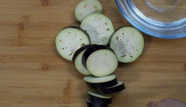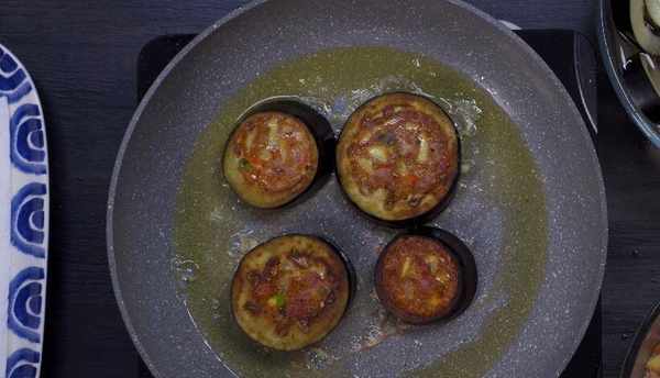 當餡料混合均勻後,茄子就可以炒瞭。鍋中加入適量的油。你不需要放太多油。接下來,將茄圈放入鍋中,然後用勺子將混合均勻的餡料加入茄圈中。煎至底部微黃,用筷子將茄子餅翻到一邊,繼續在另一邊煎至金黃色。