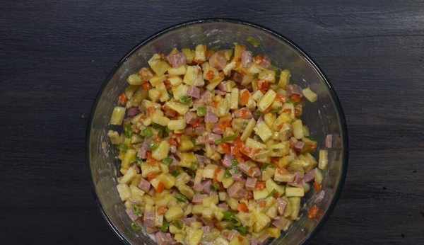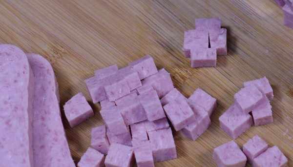 茄子切好後,我們準備一盒肉當午飯吃。午餐肉也可以用來炒飯。它更好吃。然後將午餐肉切成厚塊,再切成塊備用。將胡蘿卜和大蔥切丁。把蔥花放在一邊,然後準備一個碗,把切好的茄子放在裡面。