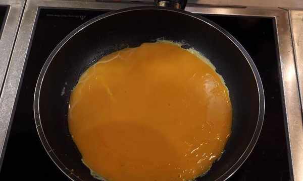 首先準備一個盤子,將米飯和香腸肉、培根或火腿、豌豆等材料一起炒香,然後放入小碗中,壓實後倒扣在盤子上,下一步就是“炒”雞蛋,準備好加入適量的雞蛋、鹽攪拌均勻備用,鍋中倒入適量的油,然後將拌勻的雞蛋倒入鍋中。