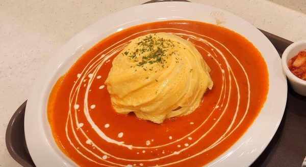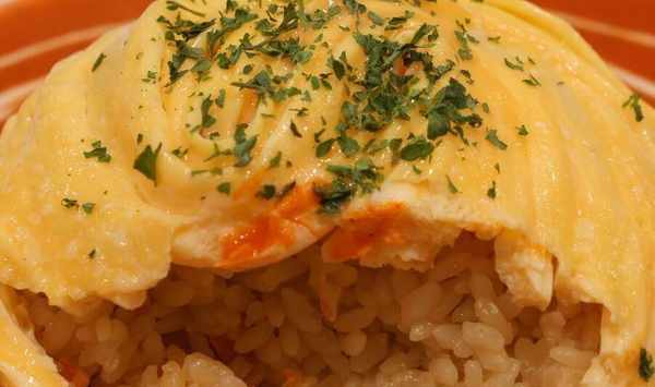 最後,將煎好的雞蛋放在提前準備好的米飯上。米飯一定要先炒,可以加入各種喜歡的食材一起炒,味道會更鮮美。