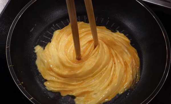 雞蛋在鍋裡煎至稍硬後,用鉗子夾住雞蛋,邊旋轉邊慢慢翻動。這個技巧也需要多練習幾次。不會炸的朋友也可以炸成圓形。