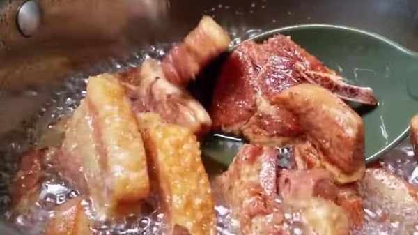 鍋中放入適量的油。油熱後,將瀝幹的五花肉倒入油鍋中,然後用漏勺翻炒,註意不要濺油。將豬肉煎至金黃色,然後從鍋中取出。它不僅聞起來很香,而且讓人看著就流口水。雖說是五花肉,但這樣炸出來也不油膩。