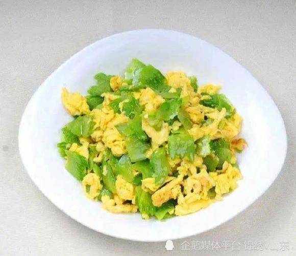 2.炒鍋燒熱放入食用油,油熱把準備好的雞蛋液放進去炒香炒熟。然後盛出備用。炒鍋再次燒熱放入食用油,油熱後把準備好的蔥花炒香,然後再放入準備好的苦瓜。用大火翻炒一分鐘。炒出鍋氣。