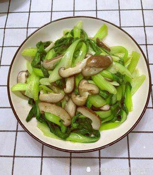 第二步、鍋裡燒水水開之後滴入幾滴油,然後下午青菜焯水十幾秒鐘炒好後撈出備用接著下香菇焯水2分鐘。