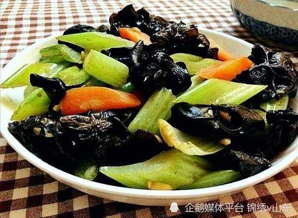 食材:芹菜,木耳,蔥,薑,蒜,鹽,雞精,花生油。
