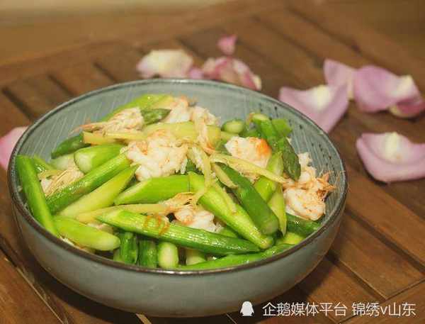7. 蝦仁變色後加入焯好的蘆筍進去翻炒;