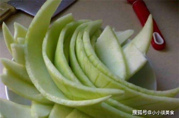 1、西瓜去皮洗凈切片,比切片的冬瓜薄一點,辣椒切絲待用。
