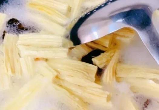 2.鍋中放入適量清水燒開,下入腐竹煮2-3分鐘,再用冷水沖洗幹凈備用。