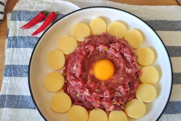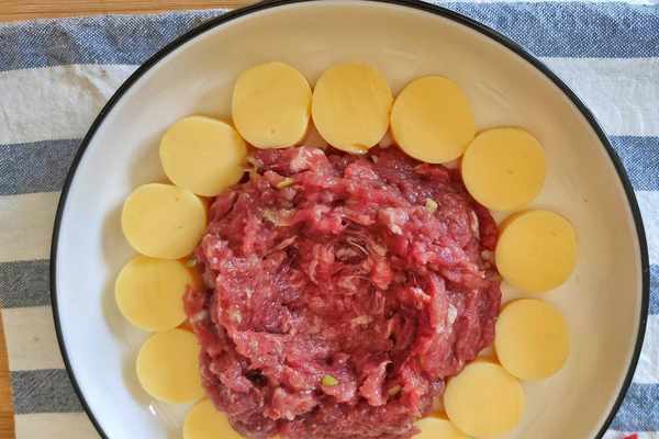 4、把豬肉末擺放在盤子的中間,用勺子在中間按一個小坑。