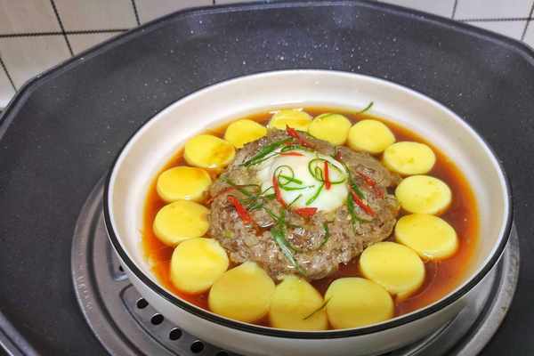 5、把雞蛋倒入坑中,放入鍋中,隔水蒸,上氣後再蒸10分鐘。