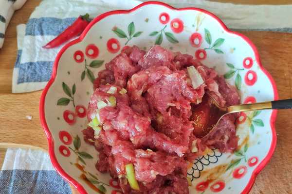 3、把豬肉切成末,喜歡吃口感更加嫩,可以加一點肥肉,加入蔥花、蠔油、生抽、胡椒粉、鹽、少許清水,攪拌均勻。