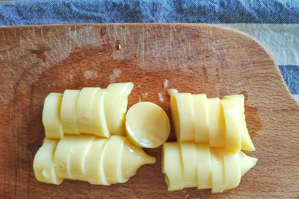 1、雞蛋豆腐直接從中間切開,然後再從袋子中輕輕地倒出來,切成薄厚均勻的豆腐片。