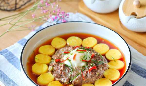 所需食材:豬肉100克、雞蛋豆腐2袋、鹽少許、蠔油1勺、生抽2勺、胡椒粉少許、食用油2勺、雞蛋1個、蔥適量、小米辣適量。