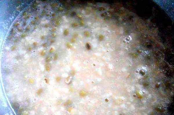 第三步:將泡好的米和綠豆放入鍋中,下冷水,再加水,待水開後,將煤氣灶調小火,邊煮粥邊用勺子不斷攪拌.綠豆和糯米搗爛至熟。