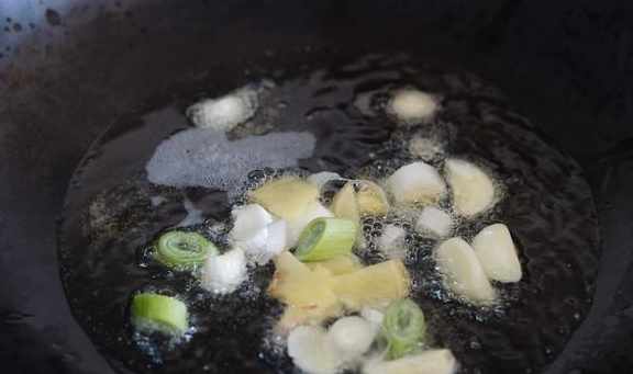 2、鍋裏加入適量的底油,放入葱薑蒜爆香。