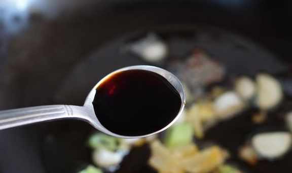 4、倒入適量的生抽和兩勺紅燒醬油。
