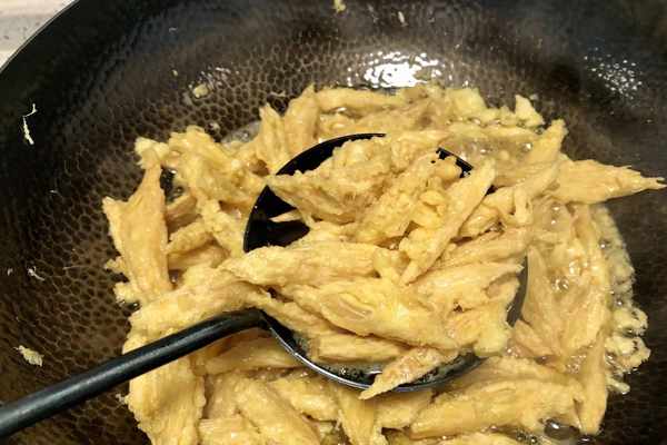 6、起鍋燒油,油溫4成熱的時候依次下入腐竹段,中火炸至腐竹表面微微焦黃發硬,撈出瀝幹多餘的油。