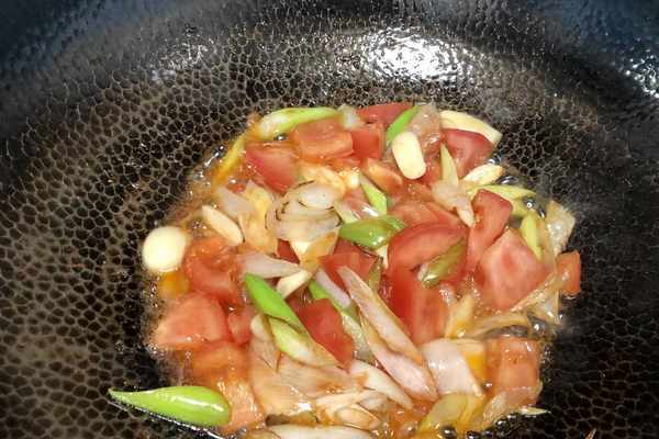 7、鍋中留少許底油,油溫5成熱下入蔥段、蒜末爆香,然後加入番茄,炒出番茄的汁水。
