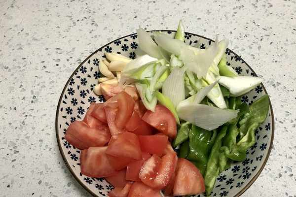 4、配菜簡單處理一下,西紅柿切成小丁、大蔥切成滾刀段、大蒜切片、龍椒切成斜片。