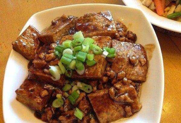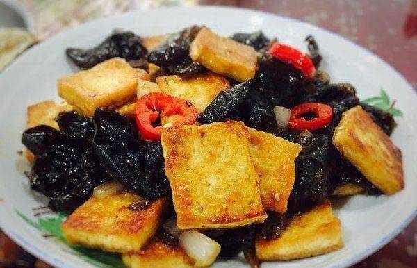 香菇醬炒豆腐:備品,將黑香菇用熱水泡發洗凈,鍋燒熱後放入油,油熱後,將豆腐掰成塊,中火炸,炸。翻一面煎另一面,炸至金黃時,放入黑蘑菇,加一勺蘑菇醬,一勺清淡的醬汁和少許糖,加約半杯水,蓋上蓋子。煮一會兒,直到湯在鍋裡變稠,撒上鍋裡的蔥花。