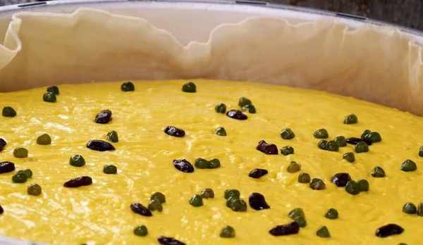 然後準備好葡萄幹和藍莓幹或者紅棗和枸杞然後在蒸籠上鋪上蒸佈,把拌勻的玉米面糊倒入蒸籠裡,然後撒上做好的葡萄幹,但是切記面團不要太稀,撒上之後葡萄幹,可以蓋上鍋蓋開始蒸瞭。