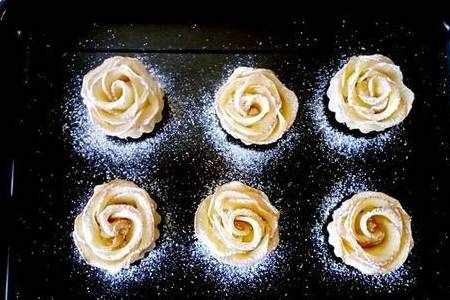 6.這樣一朵美麗的蘋果花就卷好瞭,如此類推,制作出多個蘋果花卷。
