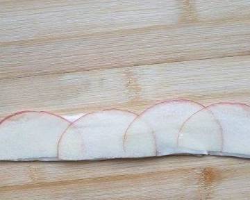 5.隨後將蘋果片按照圖示放在面皮上註意將其放在面皮寬度的二分之一處即可,然後將其卷起來。