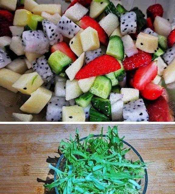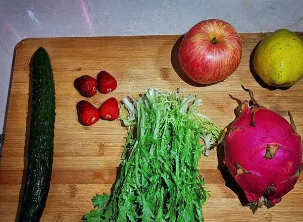 草莓4個,蘋果1個,早酥梨1個,火龍果1個,黃瓜1根,苦菊適量,酸奶適量。