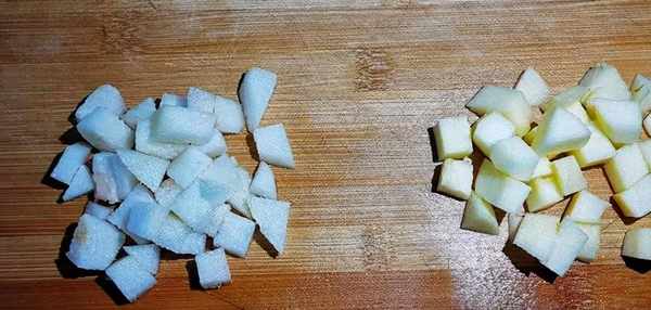 4.蘋果、早酥梨去皮洗凈,切丁,用淡鹽水浸泡,可防止表面氧化變色。