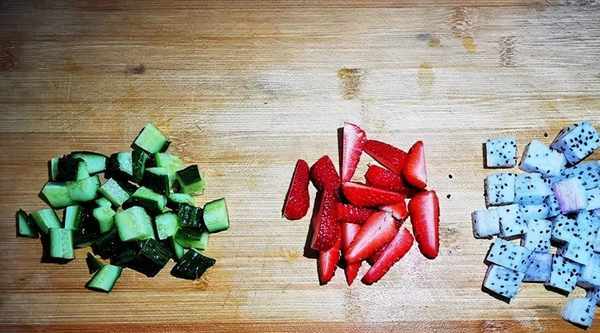 5.草莓去掉蒂部,切成兩半備用,黃瓜、火龍果分別去皮,切丁。