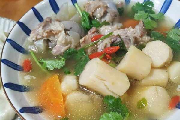 食材:湯骨1根,山藥1根,薑2片,蔥1段,香葉2片,花椒10粒,枸杞適量,香菜1小棵,鹽適量。