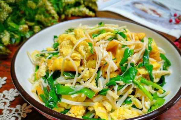 做法:1、韭菜洗凈切段,金針菇去根,洗凈撕成條,雞蛋打散打勻,薑蒜切末。