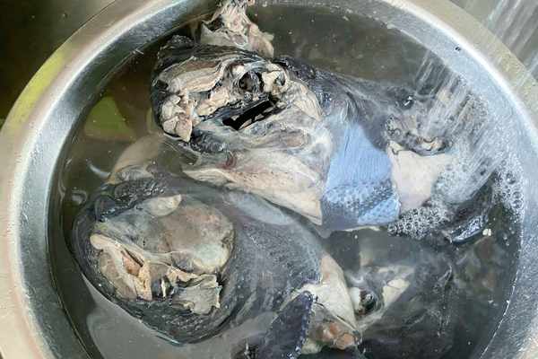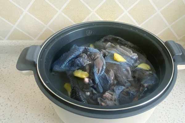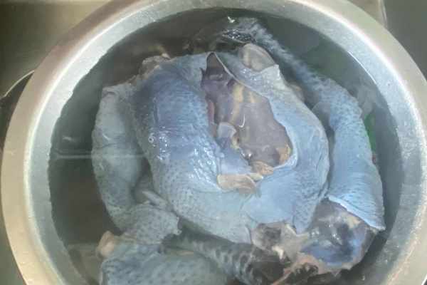 2、把烏雞用廚房剪,剪去雞頭和雞屁股,然後剪成大塊,我直接剪瞭六塊,兩個雞腿,兩個雞翅,胸膛一分為二,把剪開的雞塊清洗幹凈薄膜和血水。