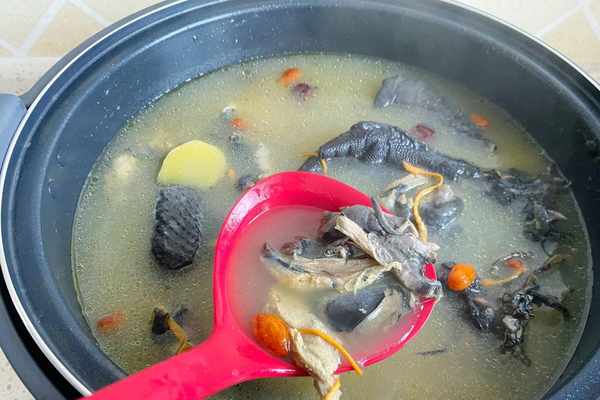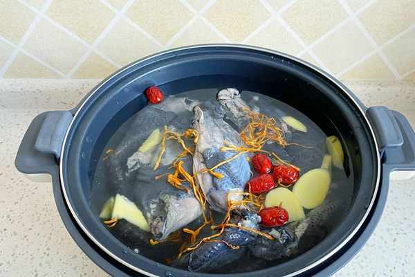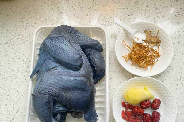 【食材】:烏雞1隻約4斤,幹蟲草花4克,生薑1塊,紅棗5顆,枸杞子6克,當歸1片(可不放),食鹽少許,清水適量
