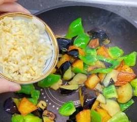 青椒炒軟後,直接放入切好的蒜末和蔥末。繼續翻炒到蔥蒜斷生