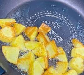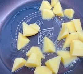第二步。這步真的不麻煩,仔細看我的順序。鍋裡放油,比日常炒菜量多一點就可以,先放入土豆,小火慢慢炸。
