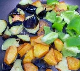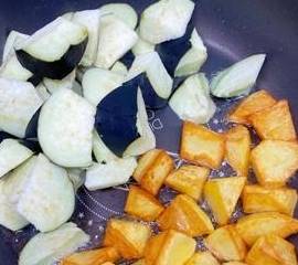 不需要把土豆撈出,直接放茄子即可。茄子非常吸油,你會發現油會瞬間被茄子吸收掉。不用在意,小火慢慢煎炸,等茄子受熱開始變色變軟時候,稍微往鍋裡續一點點油,保證不幹鍋就可以。當茄子熟瞭之後,一開始吸進去的油還會慢慢的析出,所以千萬不用一次加很多油。避免太膩