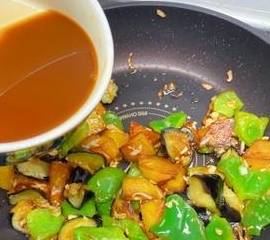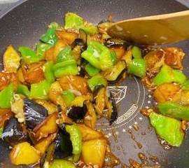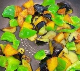 圖裡可以看到,茄子的油份滲出來瞭不少~可以開中火,翻炒一會兒,讓青椒煎出漂亮的煎痕。