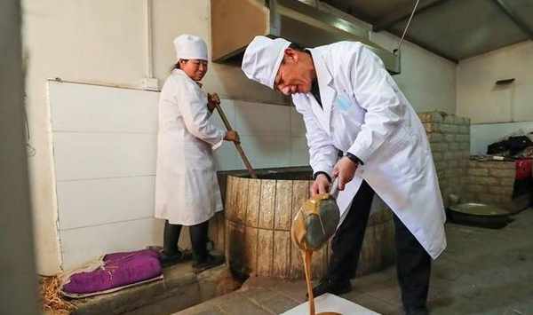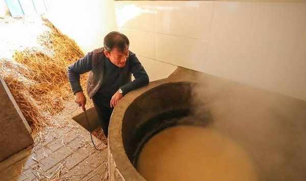 完成前期準備工作,就可以將麥芽和小米放入缸中發酵瞭。4小時後,註入開水,將糖汁沖下。“這些淋出的褐色糖水,決定著拉板糖最終的產量。”王讓民指著盛滿水的鐵盆說。