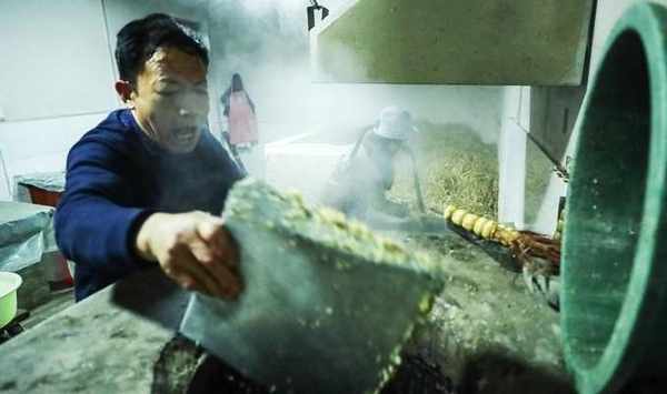 見到王讓民時,他正和妻子守在糖鍋前燒火。“制作拉板糖不能選煤或者木柴,因為制作糖時用的大鍋、中間過渡的腰鍋,還有發酵用的瓷缸都是用泥土糊起來的,底部都被封閉進一個相通的爐灶內,三個器皿共用一個進火口加熱。煤和柴放進去火源就聚在一起,爐灶內溫度不均勻,而麥稈輕便,同時可以大面積均勻燃燒。”一開口,王讓民就說出瞭制糖關鍵。