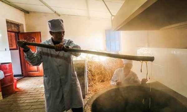 之後,這些糖汁再次返回大鍋中,經過蒸煮揮發掉多餘的水分。這時候,王讓民和妻子換人換馬手持糖鍁,不停地攪拌糖汁直至變成糊狀。