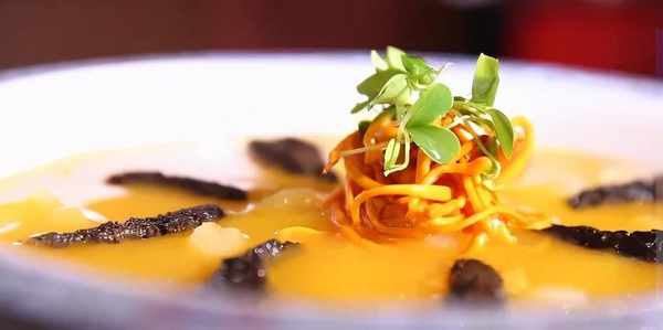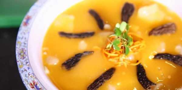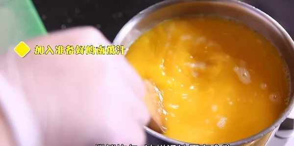 主配料準備完畢,接下來就要熬制湯汁,可以選用大骨湯、雞湯和魚湯,稍微加點食鹽和糖,還可以加入一些蔬菜汁配色。今天王大廚選用的是南瓜汁,攪拌均勻,這樣的湯汁讓人更有食欲。